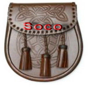 Brown Leather Sporran, Celtic embossed on body and flap, 3 leather tassels, Stud opening on flap.